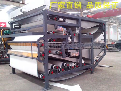 洗沙脱水设备经过浓缩的污泥与一定浓度的絮凝剂在静、动态混合器中充分混合以后,污泥中的微小固体颗粒聚凝成体积较大的絮状团块,同时分离出自由水,絮凝后的污泥被输送到浓缩重力脱水的滤带上,在重力的作用下自由水被分离,形成不流动状态的污泥,然后夹持在上下两条网带之间,经过楔形预压区、低压区和高压区由小到大的挤压力、剪切力作用下,逐步挤压污泥,以达到最大程度的泥、水分离,最后形成滤饼排出。