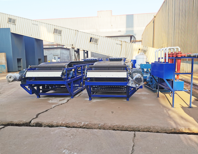 盘式真空过滤机是一种自动化程度极高的新型过滤设备。该机以滤布为介质,浆料由加料器均布在向前移动的滤布上,在真空推动力的作用下,滤液穿过滤布和胶带吸引沟进入真空箱,再由真空箱的排液孔进入集液槽中回收或排放。滤布上的滤饼经多次洗涤、抽干,在滤布转向处进入卸料处理,完成卸料之后滤布通过滤布洗刷装置进行再生。之后滤布通过一系列滤布托辊、滤布纠偏装置,再通过进料端组件上滤布压辊,又重新覆盖在橡胶带之上进入给料段、过滤、洗涤和抽干段,其操作过程是完全连续的。